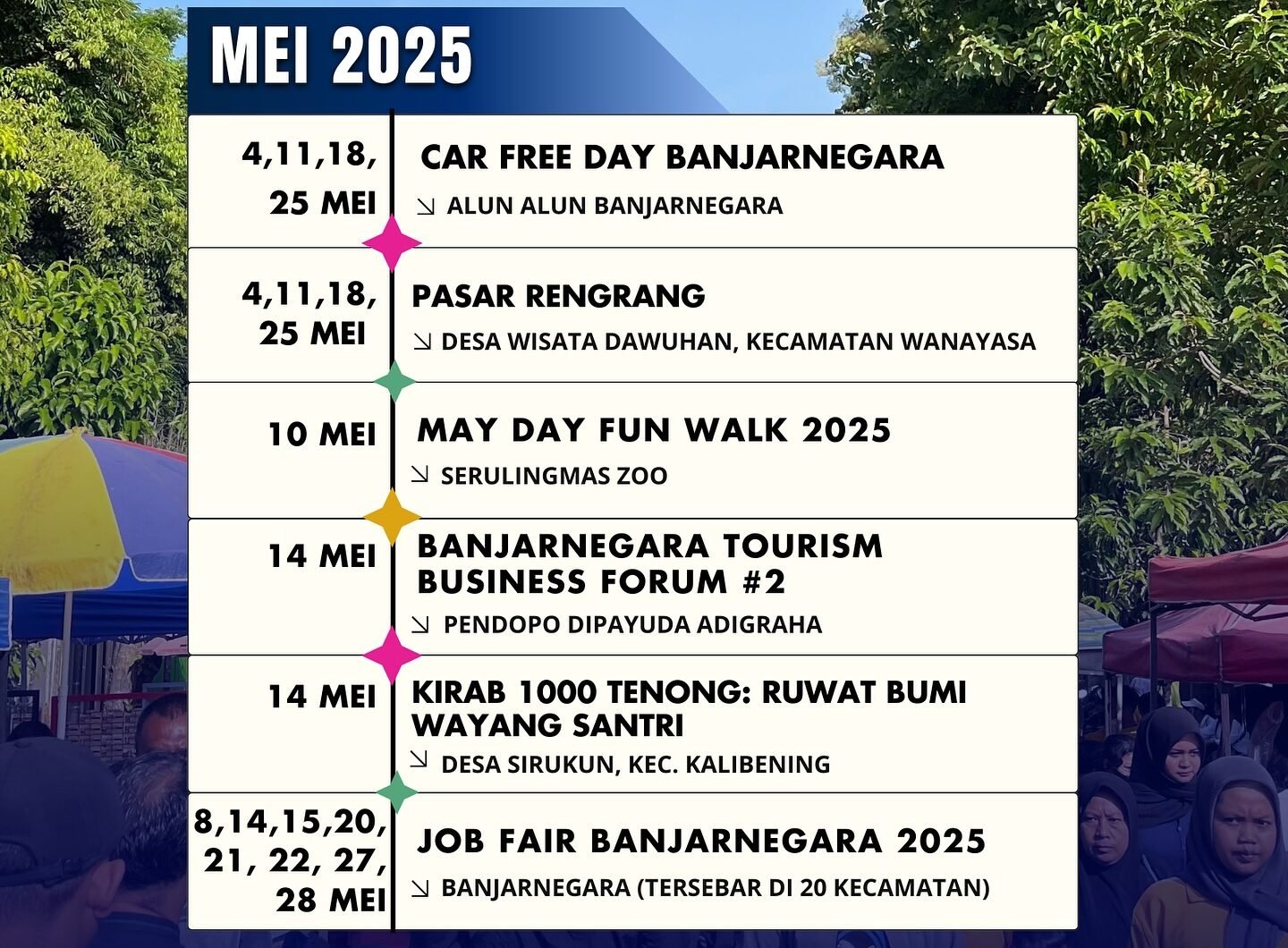Sejumlah acara budaya, wisata, hingga ketenagakerjaan akan digelar hampir setiap pekan, menjadikan Banjarnegara sebagai destinasi penuh aktivitas yang layak dikunjungi.