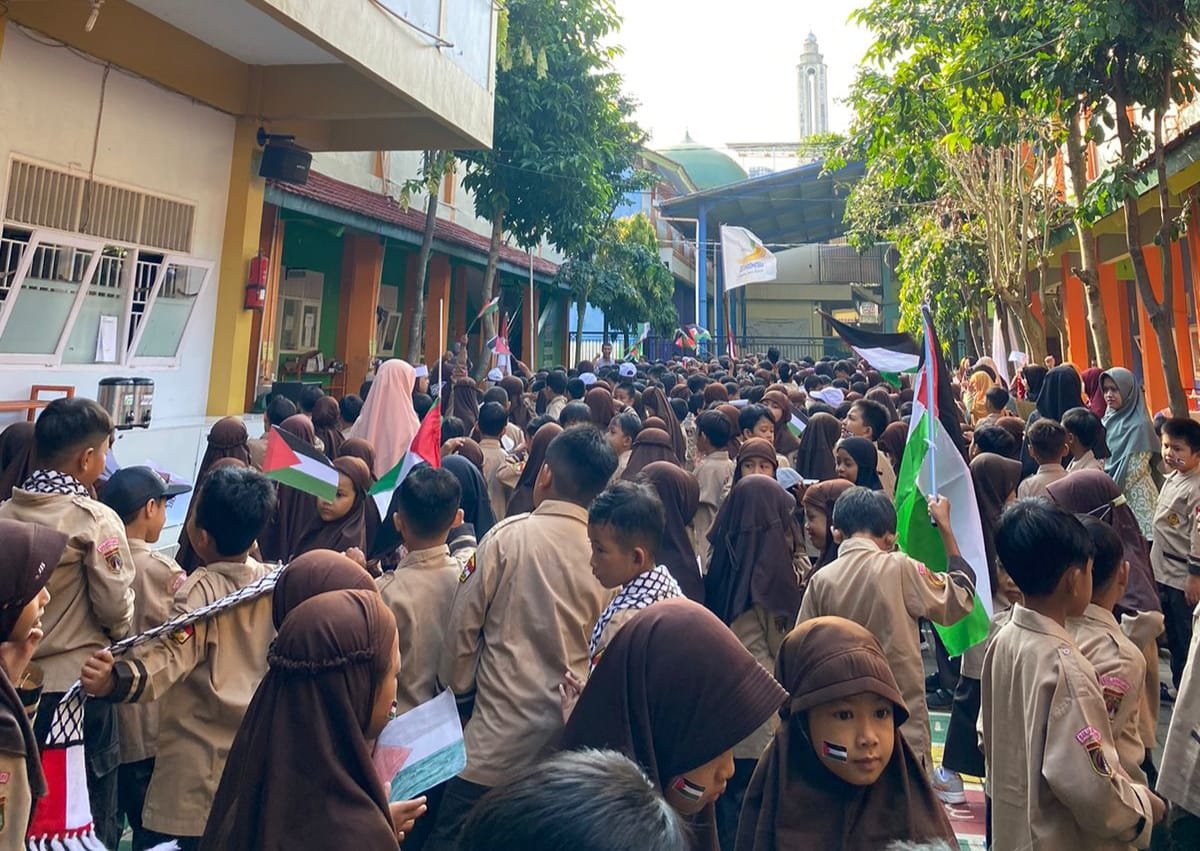 Di SDIT Permata Hati Banjarnegara, sebagian besar siswa membawa atribut Palestina berupa topi, bendera dan syal.