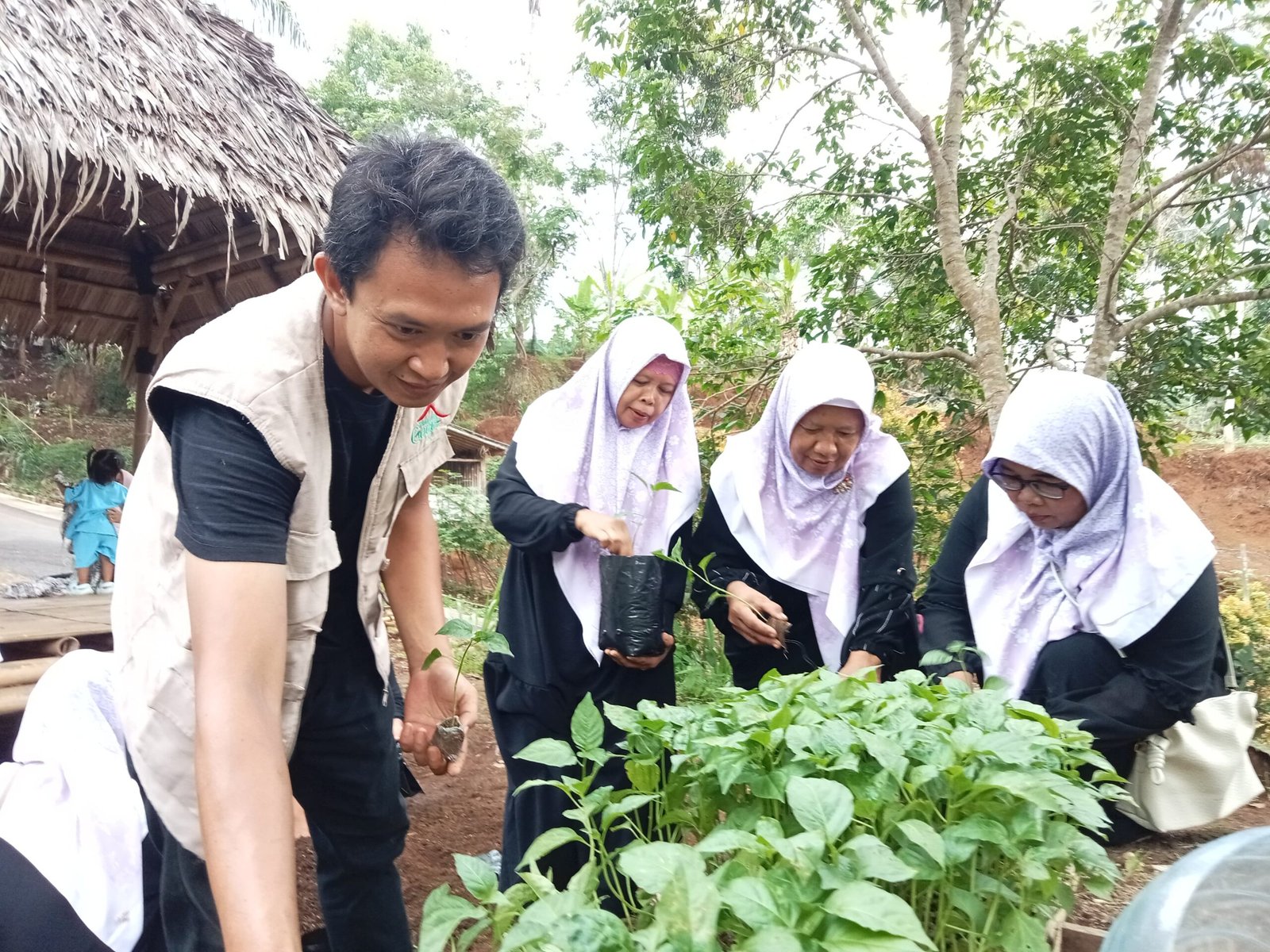 Tak hanya melihat, mereka juga ikut serta dalam praktik langsung menanam sayuran, memberikan pengalaman yang bermanfaat bagi anggota majelis taklim yang sebagian besar merupakan ibu rumah tangga.