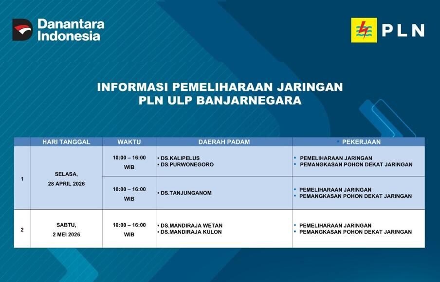 BANJARNEGARA – PLN ULP Banjarnegara akan melakukan pemadaman listrik sementara di sejumlah wilayah sebagai bagian dari kegiatan pemeliharaan jaringan dan pemangkasan pohon di sekitar jalur listrik.
