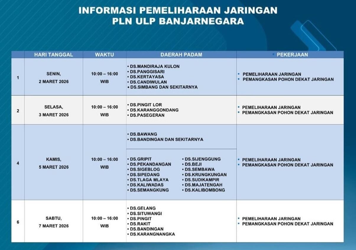 BANJARNEGARA – PT PLN (Persero) Unit Layanan Pelanggan (ULP) Banjarnegara akan melaksanakan pemeliharaan jaringan listrik selama periode 2 hingga 7 Maret 2026. Kegiatan ini mencakup perawatan jaringan serta pemangkasan pohon yang berada di sekitar jalur listrik guna menjaga keandalan pasokan.