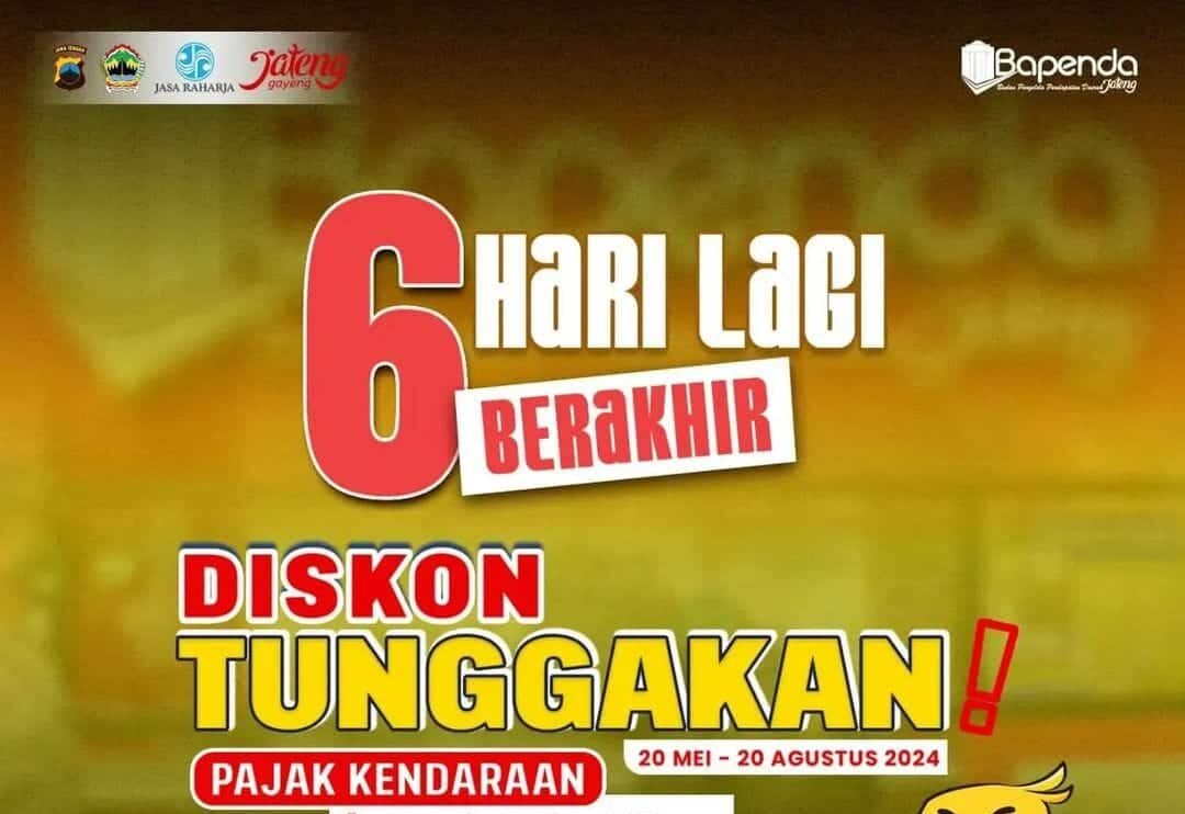 INFOBANJARNEGARA.com – Badan Pendapatan Daerah (Bapenda) Provinsi Jawa Tengah mengingatkan masyarakat bahwa promo diskon tunggakan pajak kendaraan yang telah berlangsung sejak 20 Mei 2024 akan segera berakhir. Tersisa hanya enam hari lagi sebelum kesempatan ini ditutup pada 20 Agustus 2024. Promo ini menawarkan potongan besar untuk berbagai tahun tunggakan, mulai dari tahun 2019 hingga 2023, dengan diskon yang bervariasi.